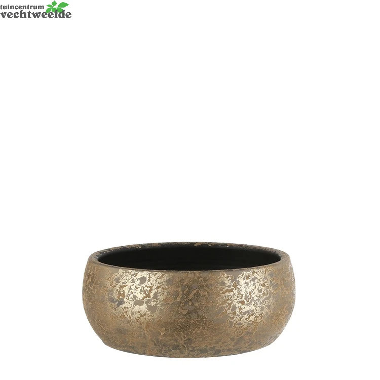 Schaal Clemente van Mica Decorations heeft door de gouden finish en unieke afwerking een luxe uitstraling. De ronde plantenschaal is afkomstig uit Portugal waar deze met de hand wordt gemaakt. Superieure terracotta klei wordt hier tot in detail gevormd, waarna de schaal wordt afgewerkt met een glazuurlaag. Door de individuele aandacht is ieder product geheel uniek! Zet er wat mooie planten in en je hebt een echte eyecatcher in huis. De Clemente serie bevat naast schalen ook potten en vazen in verschillende maten en kleuren. Deze schaal is goudkleurig en heeft een afmeting van H15 x Â37 cm.